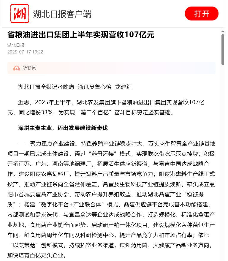 湖北日報:省糧油進(jìn)出口集團(tuán)上半年實現(xiàn)營收107億元