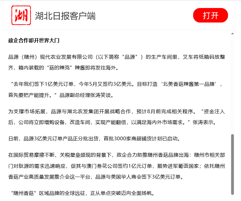 湖北日報(bào):不懼硝煙練內(nèi)功 “隨州香菇”走進(jìn)全球60多個(gè)國家和地區(qū)