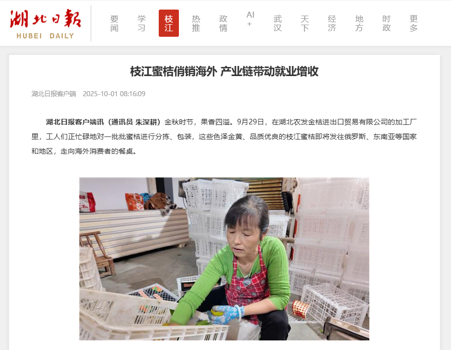 湖北日?qǐng)?bào):枝江蜜桔俏銷(xiāo)海外 產(chǎn)業(yè)鏈帶動(dòng)就業(yè)增收