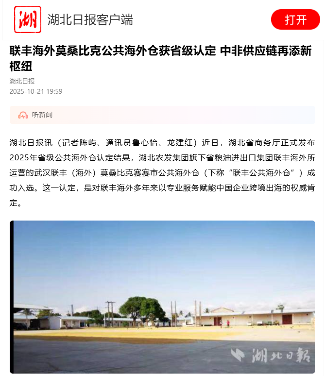 湖北日報(bào):聯(lián)豐海外莫桑比克公共海外倉獲省級認(rèn)定 中非供應(yīng)鏈再添新樞紐